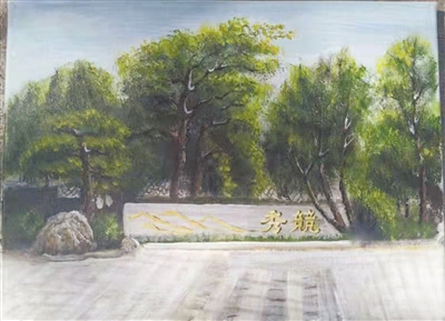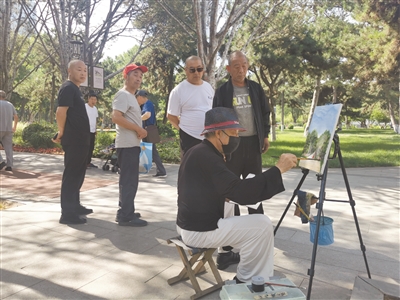 上午7時的競秀公園,廖老師上黑下白一襲唐裝,小馬扎一坐,全神貫注于自己的繪畫世界。畫架上,是一幅還未完成的初夏競秀假山圖,枝頭從泛綠到蔥郁的過渡,花兒從絢麗到斑斕的生長,綠色的韻味,澎湃著一個季節的盎然。圖案上色并非易事,每上一層顏料都要等顏料干掉,才能繼續,第二層、第三層,如此反復,這樣繪制出來的畫有著平面畫無法比擬的厚重感。