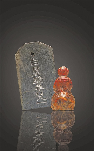 這一天上午,王咸秋在前室東北角發(fā)現(xiàn)了這枚琥珀小兒騎羊串飾。用刷子輕輕拂去塵土,它線條清晰可見,陽光下,剔透晶瑩。