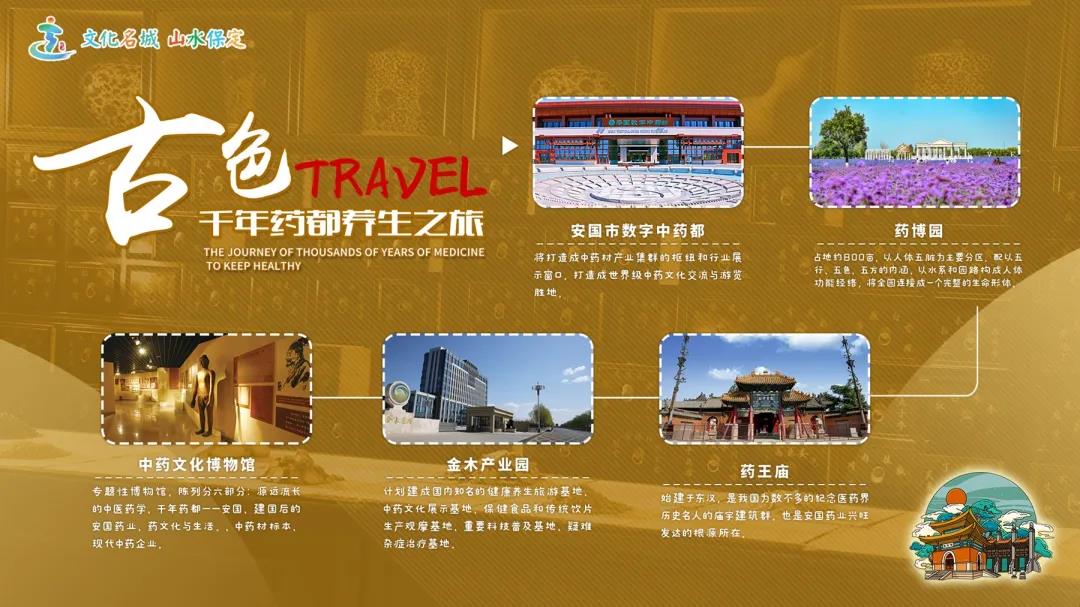 這是一條中醫(yī)保健、頤養(yǎng)身心的健康之旅。“草到安國(guó)方成藥,藥經(jīng)祁州始生香”,走進(jìn)中國(guó)中藥材之鄉(xiāng)、中藥文化發(fā)祥地之一的“藥都”安國(guó),逛藥城、拜藥王、觀藥景、購(gòu)藥物、聞藥香、賞藥花、品藥茶、食藥膳、喝藥酒、睡藥枕、洗藥浴,獨(dú)具特色的豐富體驗(yàn)定會(huì)讓您不虛此行