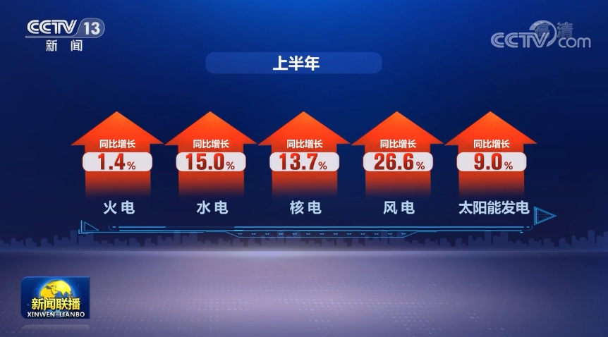 從發電看,上半年全國規模以上工業發電量同比增長13.7%。其中,火電、水電、核電、風電、太陽能發電同比分別增長1.4%、15.0%、13.7%、26.6%和9.0%。