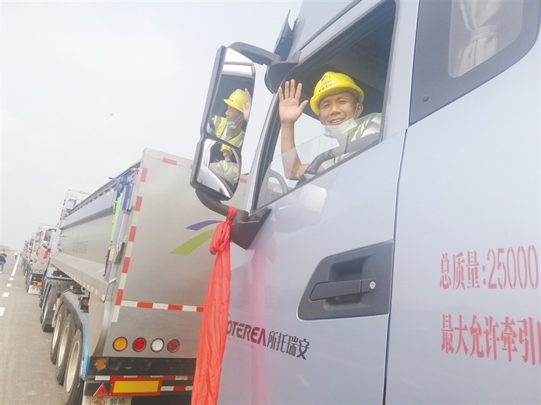 他駕駛的重卡只是長長車隊(duì)中一輛。遠(yuǎn)望,100輛重卡一字排列、看不到盡頭,一陣鳴笛后車輛一齊啟動(dòng)、前行,這在中國交通運(yùn)輸歷史上還是頭一遭。