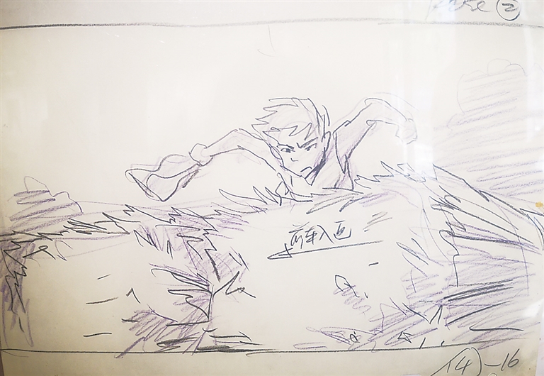 凡·公益藝術空間也可以看作是孫立軍的工作室。如今,這里充滿了動畫電影《小兵張嘎》的創作回憶。墻上,掛著《小兵張嘎》情景設定、人物設定的腳本,幾幅嘎子張開雙臂奮力奔跑的手繪圖,還排著序號。桌上,兩座半米高的嘎子銅像,一個是雙手叉腰,頭頂荷葉的嘎小子,赤著上身,褲腿高高挽起;一個則是一身整齊軍裝的小戰士,雙手握拳,目光炯炯。那個堅毅勇敢倔強的嘎子如在眼前。