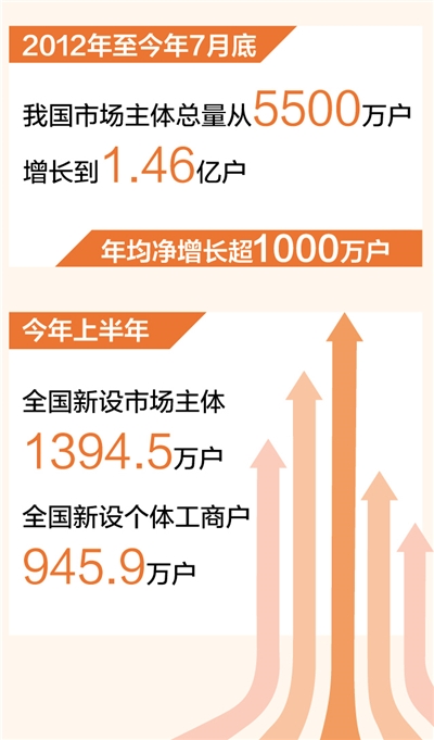 數據顯示,今年上半年,全國新設市場主體1394.5萬戶。優化登記注冊服務,激發了市場活力和社會創造力。