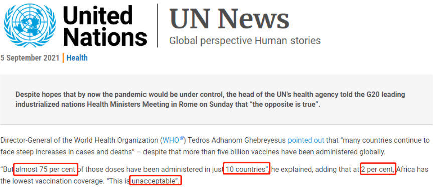 世界衛生組織總干事譚德塞在會上指出,盡管全球已接種50多億劑疫苗,但其中近75%的接種量只集中在10個國家,非洲的疫苗覆蓋率全球最低,僅為2%,“這是不可接受的”。