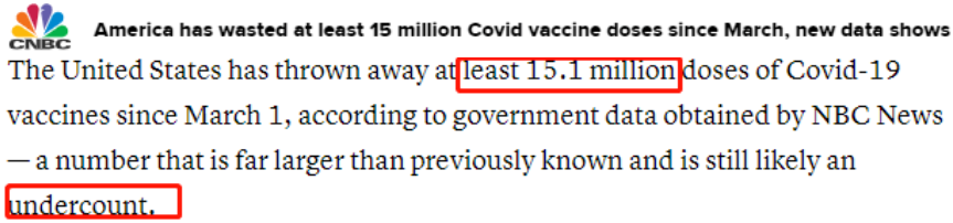 盡管有“1510萬”這樣活生生的數據戳在眼前,CDC發言人仍堅稱,相比已完成接種的劑量,美國浪費的疫苗占比非常低。然而美國全國廣播公司(NBC)的報道指出,美國浪費的疫苗“甚至超過一些國家全民所需的疫苗總數”。