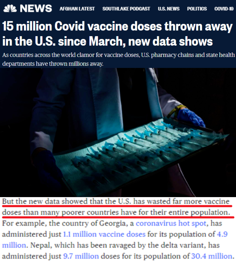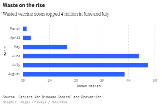 △美國全國廣播公司(NBC)針對美國每月浪費疫苗的統計圖表