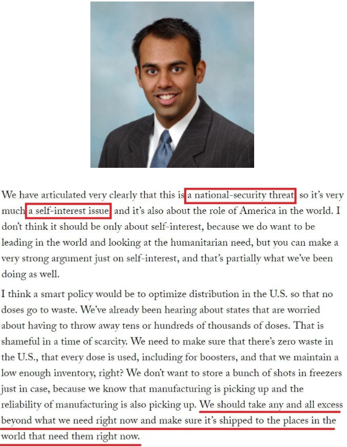對于美國當前的做法,烏達雅庫馬爾直言,這是一個“國家安全威脅”,在很大程度上更是一個“利己主義問題”。“我們應該把所有超出我們當前需要的東西都拿出來,并確保它們被送到世界上現在需要它們的地方”。
