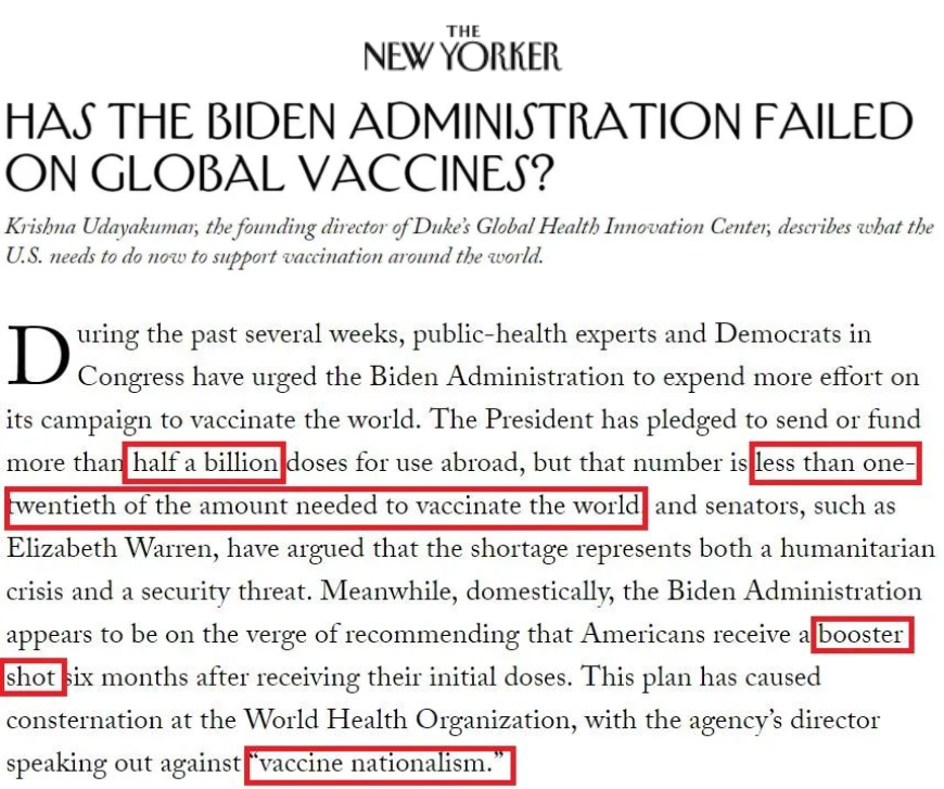△《紐約客》網站文章:拜登承諾對外提供5億劑疫苗,但這一數字還不到全球所需的1/20。與此同時,拜登政府在國內似乎即將要為美國人注射加強針,這一計劃在世衛組織引起了“疫苗民族主義”的指責。