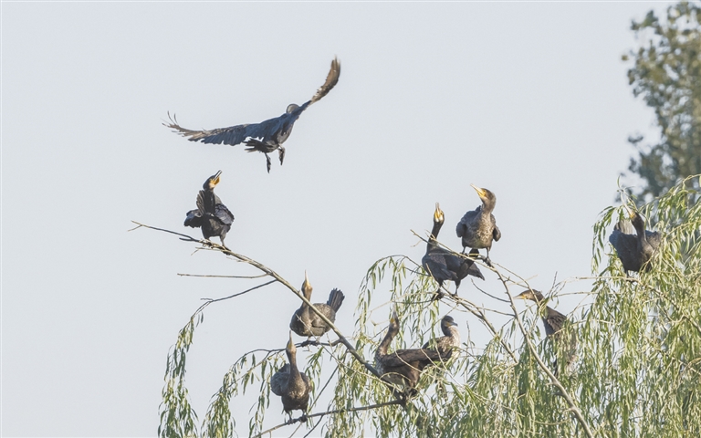 不但有白鷺空中盤旋,柳樹梢上一群鸕鶿在梳理、嬉戲,河中一只鸕鶿舉著捉到的大魚在“炫耀”,好一幅美麗的水鄉(xiāng)畫卷。鳥類的多樣性,近年來隨著生態(tài)環(huán)境的持續(xù)改善正在呈現。
