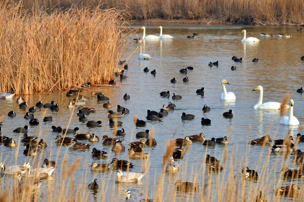 白天鵝等候鳥在山東黃河三角洲國家級自然保護區里棲息(2014年12月22日攝)。 新華社記者 郭緒雷 攝