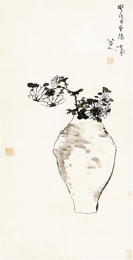 朱耷擅長花鳥、山水、書法,以白眼向天的花鳥聞名于世;但這幅題識為“甲戌年之重陽畫”的《瓶菊圖》卻因其親切寧靜的氣息受到世人的鐘愛。畫中菊花的高低錯(cuò)落、疏密聚散在落筆時(shí)就用心經(jīng)營過了,瓦罐也因柔韌自如的線及透明淹潤的點(diǎn)在土氣的質(zhì)感之外又多了一份靈氣,畫面恬淡、自然。