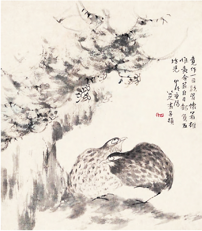 這一年,朱耷似乎興致很高,除了《瓶菊圖》外還創(chuàng)作了《魚鳥圖》以及《安晚冊》中的《鵪鶉》,均有題識可考。《魚鳥圖》中石頭的造型圓潤,用筆圓融,鳥之閑棲、魚之悠游見諸筆端。“鵪”與“安”諧音,鵪鶉的形象有平安的寓意。畫面中兩只鵪鶉偏安于怪石之下,石縫中點(diǎn)綴了數(shù)朵菊花,生氣十足。