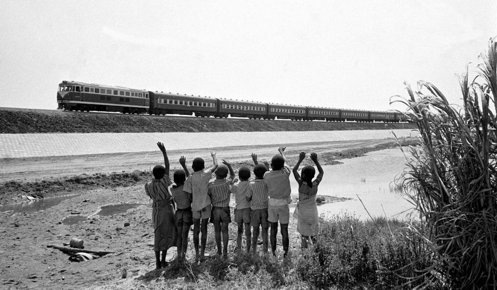 ↑1976年,贊比亞魯西瓦西湖畔的少年兒童歡迎坦贊鐵路的列車通到他們的家鄉。