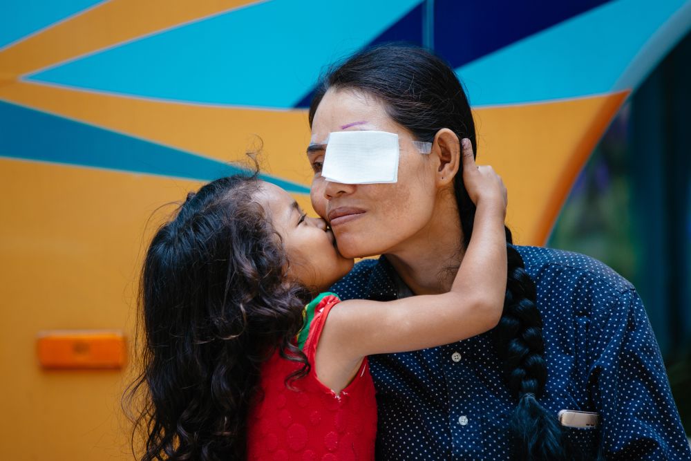 ↑2019年3月15日,在柬埔寨磅湛省醫院,接受中國醫療隊白內障義診手術患者孫美樂得到女兒親吻祝福。
