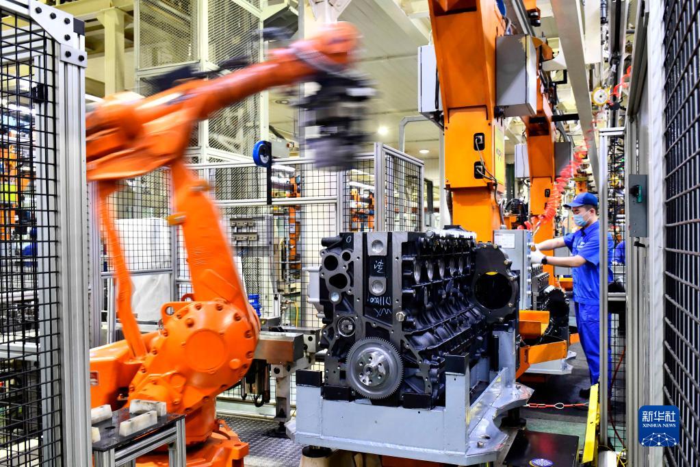 在位于山東濰坊的濰柴集團總裝車間,工人在流水線上裝配發動機(4月22日攝)。新華社記者 郭緒雷攝