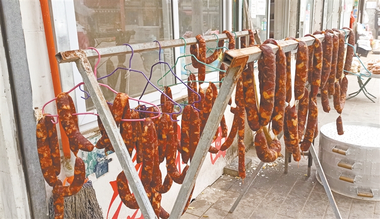 而在北河沿市場臨時安置點西側的一家豬肉銷售店內,老板也正忙著將剛剛灌制好的香腸掛起來,“今年的生意真不錯,來灌香腸的顧客不少,大多數還是喜歡五香口味的,麻辣的也有。今年我們也加了廣味的,那是屬于甜口的,南方人愛吃,銷量不是很大,咱們保定人還是比較認可麻辣和五香的?!?/p>