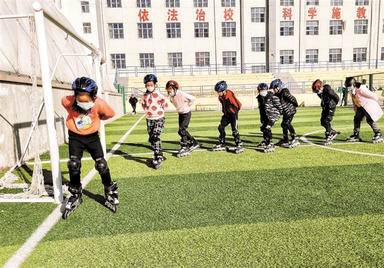除了職教中心的四個冰雪場館,定興縣各個中小學也在校內開展豐富多彩的冰雪運動。有的老師精心編排了冰雪運動課間操,有的在體育課里融入冰雪運動,有的在第二課堂加上有趣的冰雪活動。
