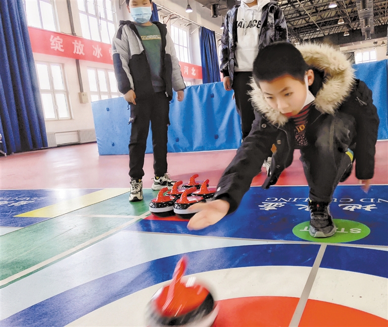 “我是五年級的,他是六年級的,以前沒滑過冰,也沒見過冰場,這里太好玩兒了,Very Good,好玩兒!”專業級的真冰館里,一個胖墩墩的小男生滿頭大汗地邊滑邊說著。在二樓的仿真冰館里,冰蹴球、冰壺體驗區熱火朝天,教練邊指導邊示范,學生們邊練習邊對戰,歡呼聲、叫好聲此起彼伏。