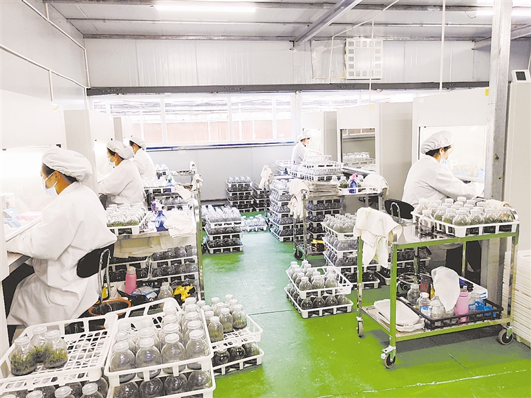 “之前在村里給別人做些縫紉的手工活,去年才來,感覺這個工作挺干凈,還有休息日,工資也不低。現(xiàn)在這分兩個組,我們組三個人只做蝴蝶蘭苗,另一個組十幾個人,做文心蘭、秋石斛、春石斛等苗。”任杰說,上崗前培訓了一個月,主要是怎么切苗、怎么分苗,以及工作前后對工作臺消毒殺菌。“一天四遍,保證無菌操作。身邊很多人都過來上班了,環(huán)境好也能學些東西,每天和花花草草在一起,人也變得精神了。”