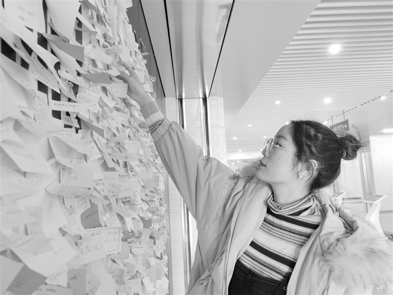 12時(shí)15分,學(xué)生們陸續(xù)離開圖書館,在經(jīng)過“心愿墻”時(shí),同學(xué)們紛紛停下腳步。“當(dāng)你真心渴望一件事的時(shí)候,日月星辰都會(huì)幫你達(dá)成愿望。”在學(xué)生小涵的這條祝福語旁,計(jì)算機(jī)專業(yè)的大三學(xué)生鄭思思也貼上了自己的目標(biāo):“馨清樓624全體室友期末考試全部通過。”“很有意思,我?guī)缀趼愤^一次就要來看,感覺特別溫馨!”電子信息工程學(xué)院的大三學(xué)生張潤通告訴記者。尤其是看到一個(gè)“爸爸媽媽,身體健康、事事順心,我要對爸爸媽媽更好更好無敵的好,不讓爸媽失望!”的留言,覺得心里很有觸動(dòng)。他說,雖然自己還沒有在心愿墻上寫下祝福,但看看同學(xué)們的祝福,不僅能為自己打氣,也給遠(yuǎn)在外地的父母報(bào)以祝福。