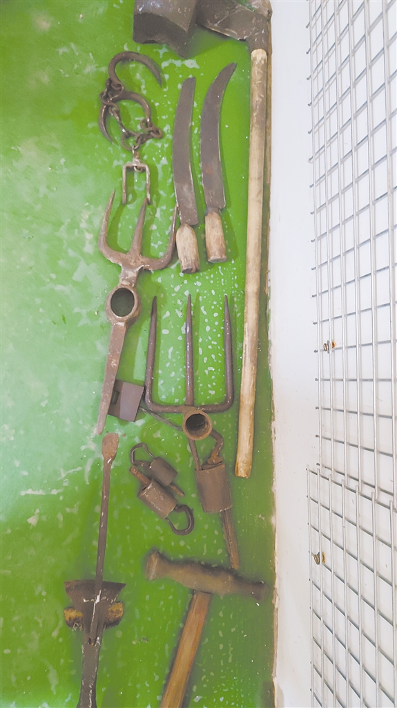 有各式各樣的壇子罐子,根治海河會戰時吃飯的大缽碗,挑水用的扁擔,柏木制成的水筲,轆轤的搖把,有專門用來從水井里撈水桶的“一窩蜂”,還有專門把麥秸捆、谷子個兒往車上扔的二股禾叉……