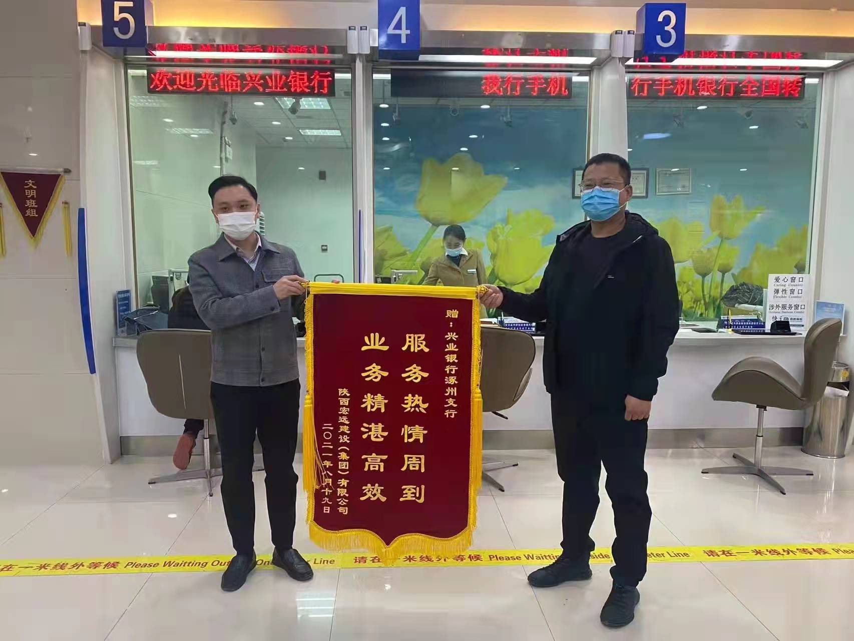 “支付為民,開戶不難。”日前,陜西一建設(集團)有限公司專門派人到興業(yè)銀行涿州支行表達感謝,并贈送了一面寫有“服務熱情周到,業(yè)務精湛高效”的錦旗。