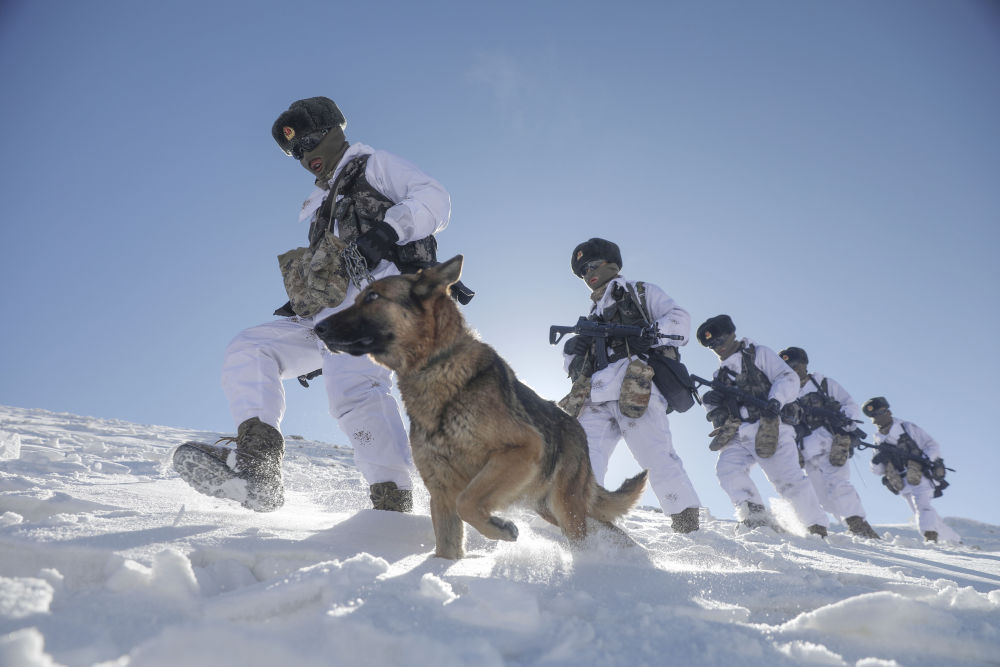 ↑2021年2月11日,駐守帕米爾高原的新疆喀什軍分區某邊防團托克滿蘇邊防連官兵按計劃對海拔5100米的山口實施例行巡邏。
