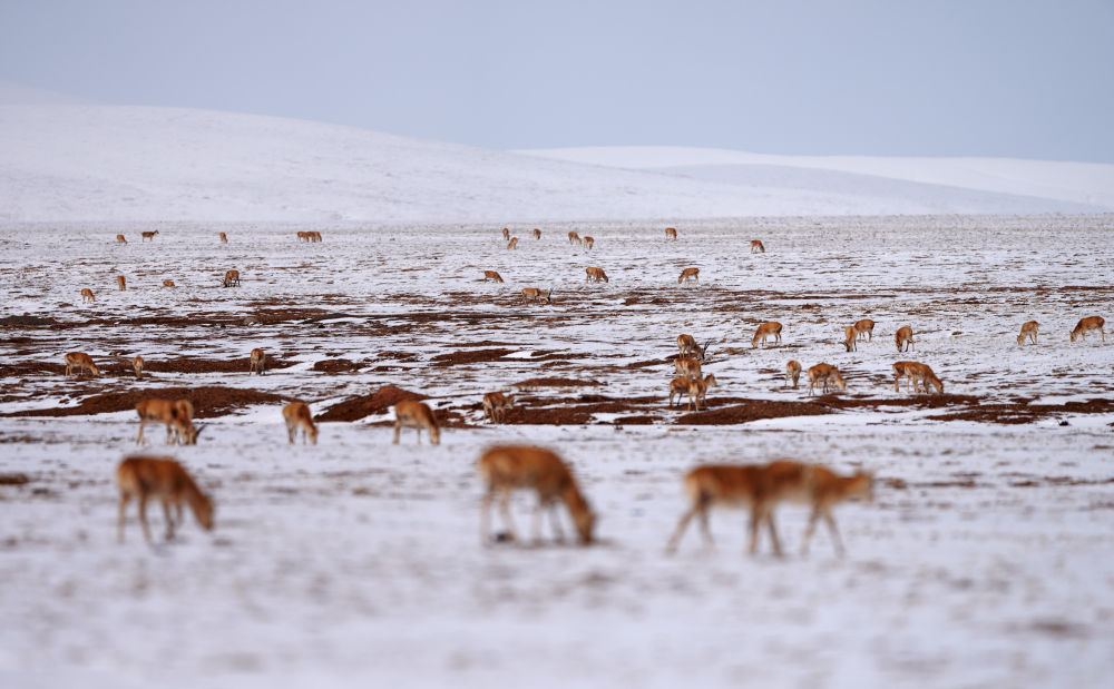 ↑2021年4月20日,在青海可可西里,一群正在遷徙的藏羚羊向卓乃湖方向行進。