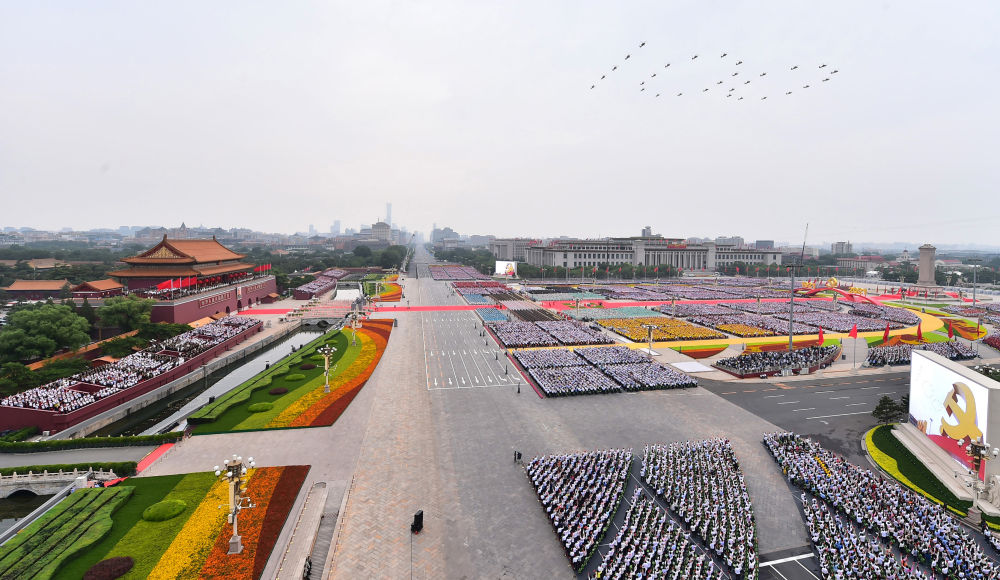 ↑2021年7月1日上午,慶祝中國共產黨成立100周年大會在北京天安門廣場隆重舉行。這是飛行慶祝表演。