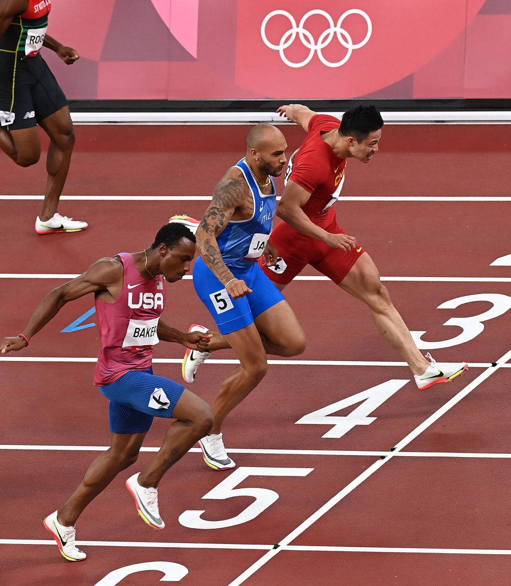 ↑2021年8月1日,東京奧運會田徑男子100米半決賽在東京新國立競技場舉行。中國選手蘇炳添(右一)跑出9秒83,以半決賽第一晉級決賽,同時創造了新的亞洲紀錄。