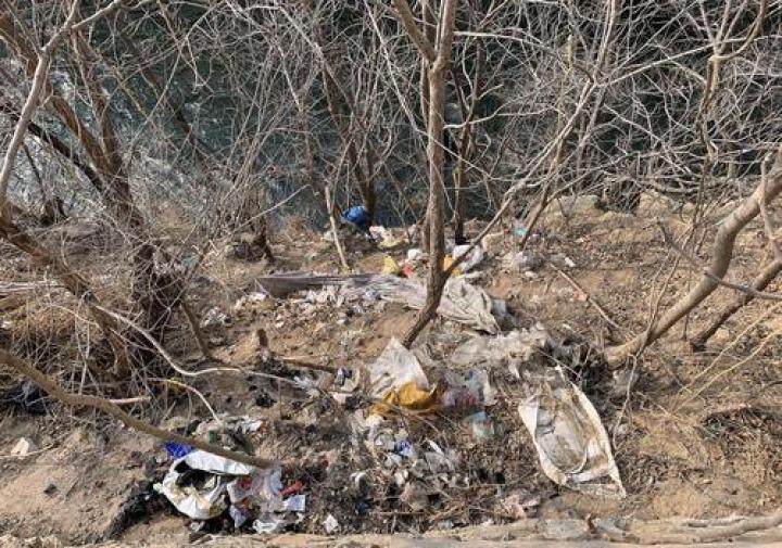 沙河總干渠北水峪村段內(nèi)河坡上的垃圾。