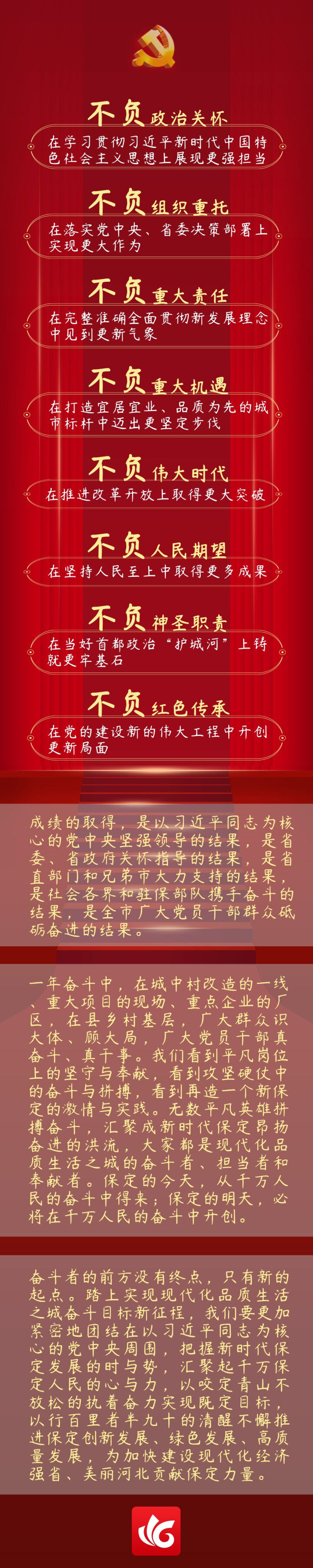 1月12日,中國共產黨保定市第十二屆委員會第三次全體會議隆重召開。市委書記黨曉龍受市委常委會委托,向全會作工作報告。