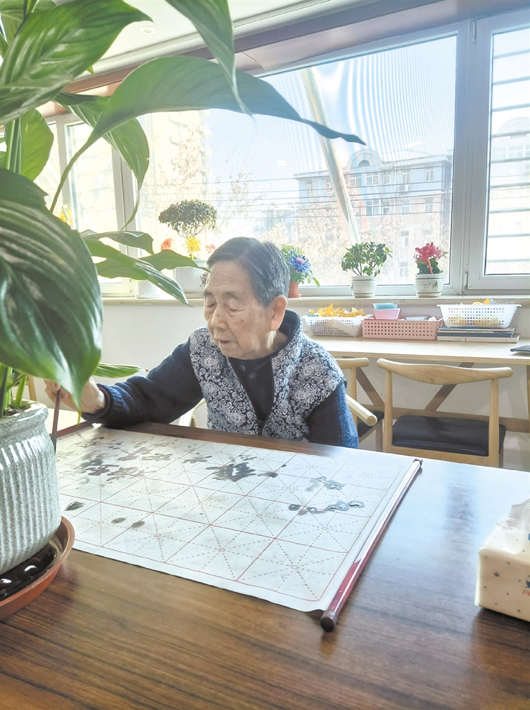 “這是我母親,已經(jīng)94歲了。”張黎利的老母親也住在敬老院,在活動室正在和另一位92歲的崔志華老人唱“晚上歸來魚滿艙……”;而旁邊一位阿姨正在寫毛筆字,身后一位護工照看著活動室里的五六位老人。