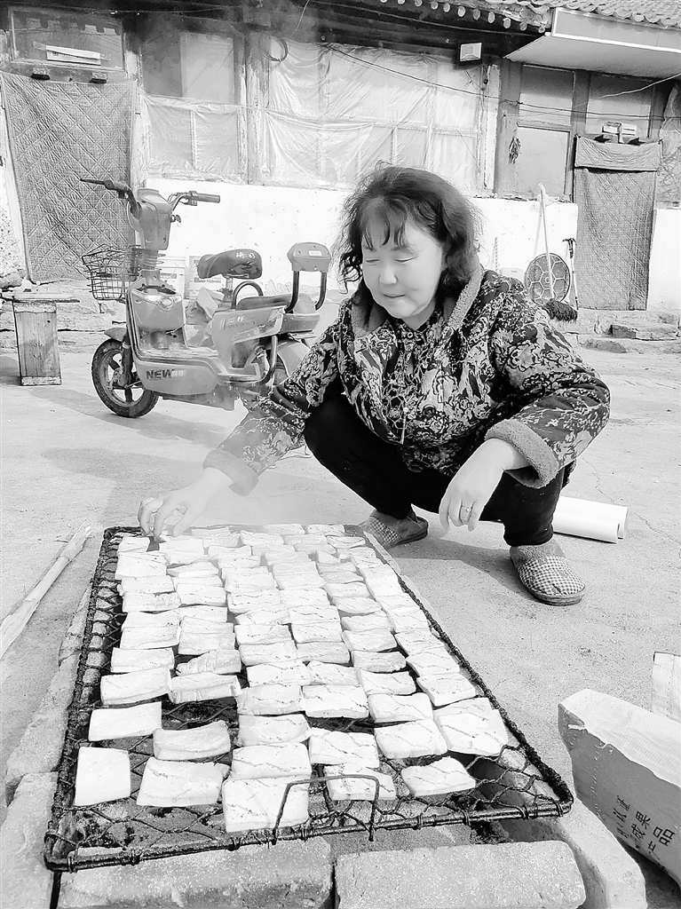 臨近中午,記者來(lái)到隔壁于合明夫妻的房間。屋里的櫥柜上,酸漿豆腐切成了方塊,張曉琴將豆腐切成一厘米厚的方片,然后在院子里用谷糠熏成豆腐干。“早上就開(kāi)始了,要熏到下午三點(diǎn)才行,然后燒一鍋水,加上花椒鹽,將熏制好的豆腐干泡上,能長(zhǎng)時(shí)間吃,不壞。”過(guò)去春節(jié)新鮮蔬菜少,村民創(chuàng)造出這了這種獨(dú)特美食技藝,流傳到現(xiàn)在,成了家家戶戶愛(ài)吃的一道美食。