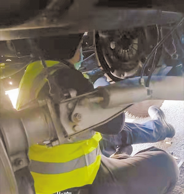 冰冷的高速公路上,志愿者鉆進車下修理故障車。 劉強 供圖