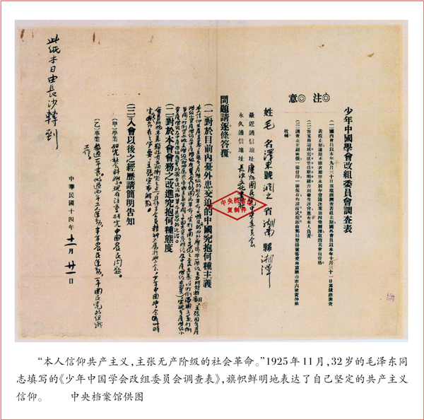 ——“毛澤東同志在青年時期就立下拯救民族于危難的遠大志向……十月革命一聲炮響,給中國送來了馬克思列寧主義。從紛然雜陳的各種觀點和路徑中,經過反復比較和鑒別,毛澤東同志毅然選擇了馬克思列寧主義,選擇了為實現共產主義而奮斗的崇高理想。在此后的革命生涯中,不管是‘倒海翻江卷巨瀾’,還是‘雄關漫道真如鐵’,毛澤東同志始終都矢志不移、執著追求。”