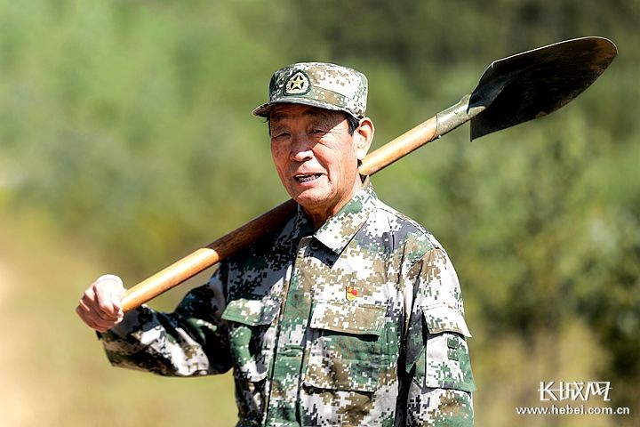 張連印與教育基地工人在北梁山坡種樹,圖為張連印正在搬運樹苗。河北省軍區 丁美寧 攝