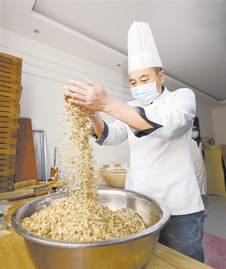 做好米粉,元宵餡更是講究。“就拿五仁餡來說,先把白芝麻、核桃、花生、葵花籽、西瓜仁、青紅絲、葡萄干等原料一一挑揀、清洗,之后炒熟,碾成不同大小的顆粒。最后把研碎的原料攪拌在一起,放進(jìn)模具里打餡,再切成四方狀,靜置一夜讓餡料凝固成形。你算算,這得是多少道工序?”劉文良介紹說。