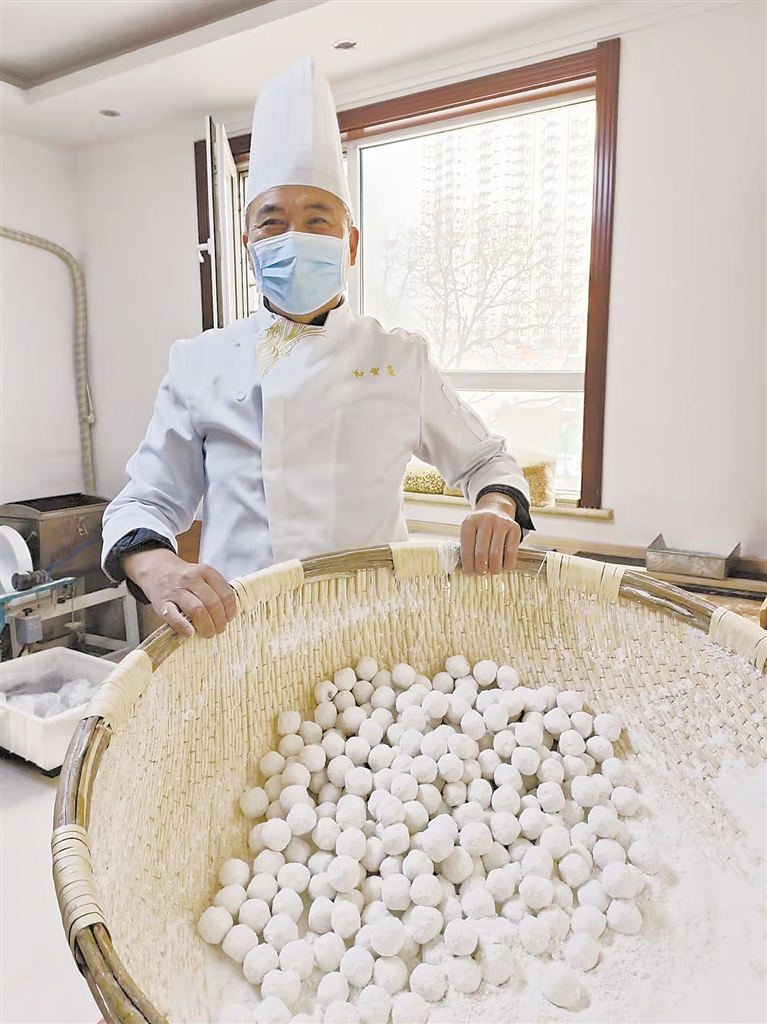 “手搖元宵雖然慢,但這門老手藝不能丟。”顧不上擦掉粘在臉上的面粉,劉文良展示起手搖元宵這門傳統(tǒng)手藝。一箱餡料倒進(jìn)掛漿面盆里,掛漿沉淀后投進(jìn)盛滿糯米粉的笸籮內(nèi),兩只手推著笸籮邊緣前后晃動,原本棱角分明的四方餡料很快被糯米粉包裹起來。然后再次掛漿,繼續(xù)在滾上糯米粉的笸籮里晃動,反復(fù)4遍之后,乒乓球大小的元宵就制作出來了。“我搖一笸籮元宵大約需要15分鐘,每個元宵的重量為25克左右,這就要求手上有準(zhǔn)。”劉文良放到旁邊的臺秤上一稱,一斤恰好20個。