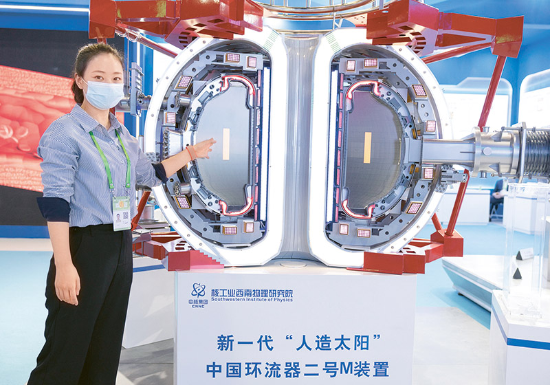 科技創(chuàng)新為高質(zhì)量發(fā)展注入強勁動能,助力創(chuàng)新型國家建設(shè)新征程。圖為2021年10月21日,在北京展覽館舉行的國家“十三五”科技創(chuàng)新成就展上,工作人員介紹新一代“人造太陽”中國環(huán)流器二號M裝置。中國環(huán)流器二號M裝置是我國目前規(guī)模最大、參數(shù)最高的新一代先進磁約束核聚變實驗研究裝置,等離子體離子溫度可達到1.5億攝氏度,是實現(xiàn)我國核聚變能開發(fā)事業(yè)跨越式發(fā)展的重要依托裝置。 新華社記者 才揚/攝
