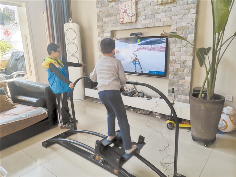 毛小明的兩個兒子正在家中的“滑雪訓練機”上開心地玩兒著。