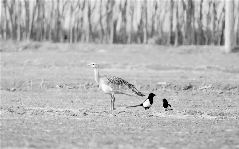 據介紹,大鴇機警,很難靠近,善奔走、不鳴叫,非遷徙時的飛行高度不超過200米。一年中的大部分時間集群活動,形成由同性別和同年齡個體組成的群體。大鴇別稱老鴇、獨豹、野雁,屬于國家一級保護動物,有兩個亞種。雄鳥的頭、頸及前胸灰色,其余下體栗棕色,密布寬闊的黑色橫斑。頦下有細長向兩側伸出的須狀纖羽。雌雄鳥的兩翅覆羽均為白色,在翅上形成大的白斑,飛翔時十分明顯。成鳥兩性體形和羽色相似,但雌鳥較小。大鴇主要棲息于開闊的平原、干旱草原、稀樹草原和半荒漠地區,也出現于河流、湖泊沿岸和鄰近的干濕草地,特別是在冬季和遷徙季節常在農田中活動。