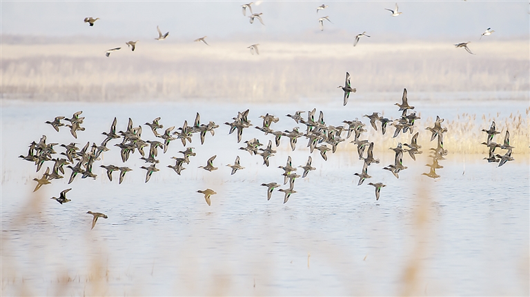 碧水藍天間,成群的鳥兒在蘆葦叢中或嬉戲、或覓食、或結伴飛舞、或萬鳥翔集……真可謂水光山色與人親,說不盡、無窮好。