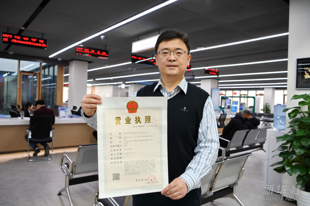 一家入駐雄安新區(qū)的企業(yè)工作人員在市民服務中心內展示辦理的營業(yè)執(zhí)照(2019年1月17日攝)。