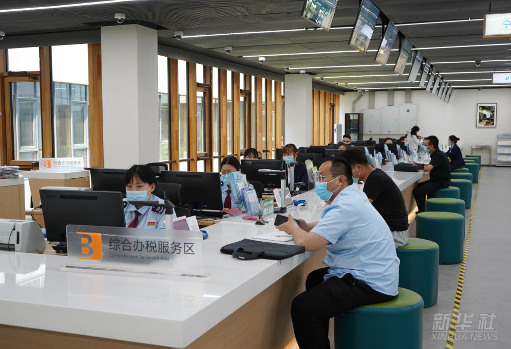 工作人員在河北雄安新區(qū)政務服務中心綜合辦稅服務區(qū)為居民辦理業(yè)務(2021年5月12日攝)。雄安新區(qū)政務服務中心成立于2018年5月30日,為企業(yè)和個人提供“一站式”行政審批事項受理和便民業(yè)務受理。