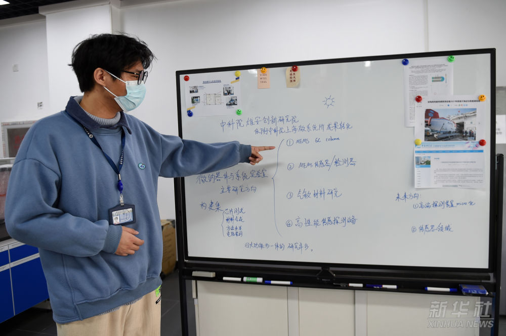 中科院雄安創(chuàng)新研究院工作人員介紹微納器件與系統(tǒng)實驗室主要研究方向(2022年3月8日攝)。2019年12月,中國科學院與河北省政府簽署協(xié)議,合作共建“雄安創(chuàng)新研究院”,重點突破產業(yè)基礎性關鍵技術、新興產業(yè)核心技術和開辟新領域的變革性技術,推動研究成果轉移轉化。