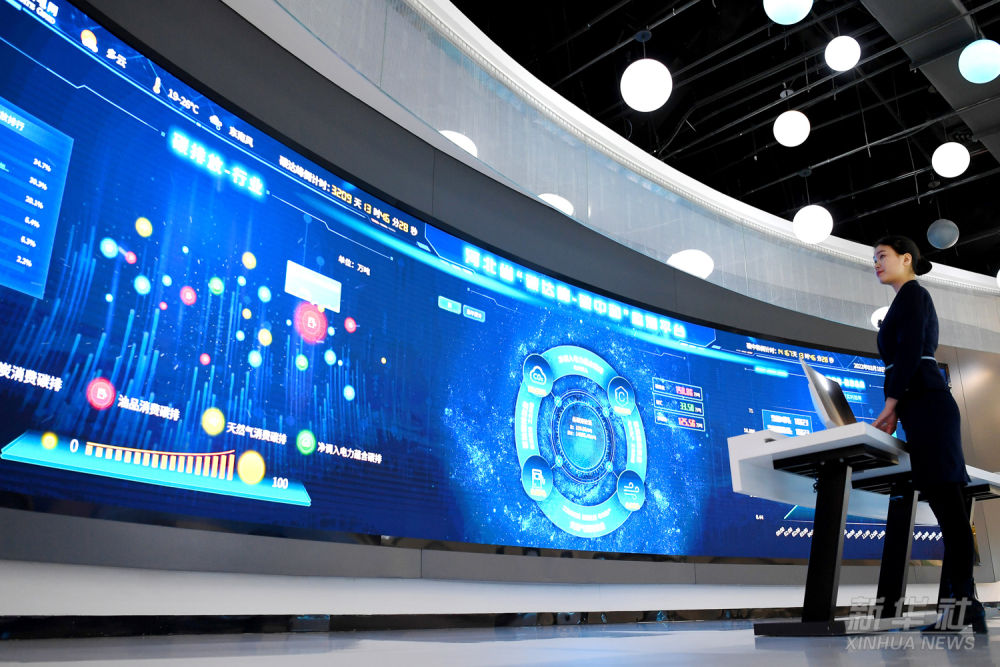位于雄安新區(qū)首座新建220千伏變電站——劇村站內的“碳達峰、碳中和”監(jiān)測平臺,通過電力大數(shù)據(jù)折算碳排放量,對雄安新區(qū)碳排放、碳減排、碳匯進行實時監(jiān)測分析(2022年3月18日攝)。