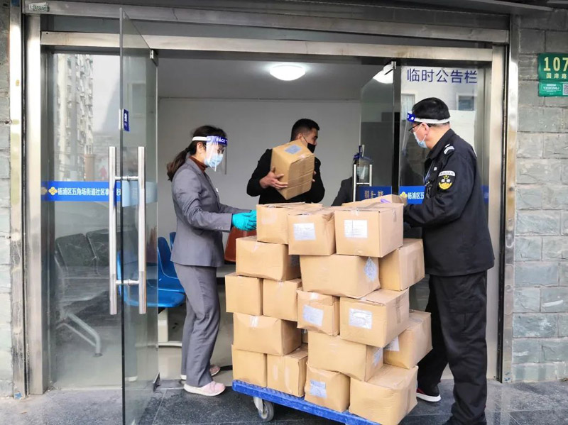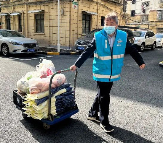 長寧區仙霞新村街道,仙霞物業公司負責管理的一封控小區,老年人比較多,被封控之后,他們不會使用智能手機上網購買生活物資。因此,物業工作人員便成了小區的“閃送員”,主動承擔起為小區獨居老人、高齡老人和行動不便老人采購生活物資的工作。長寧融媒體中心供圖