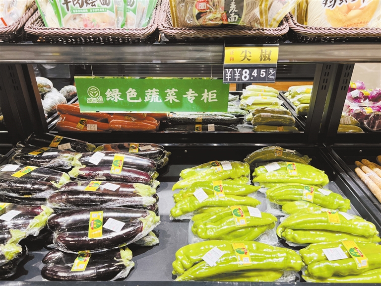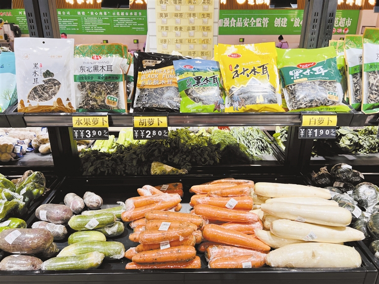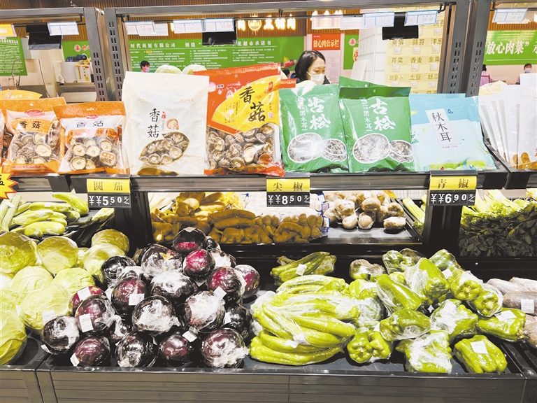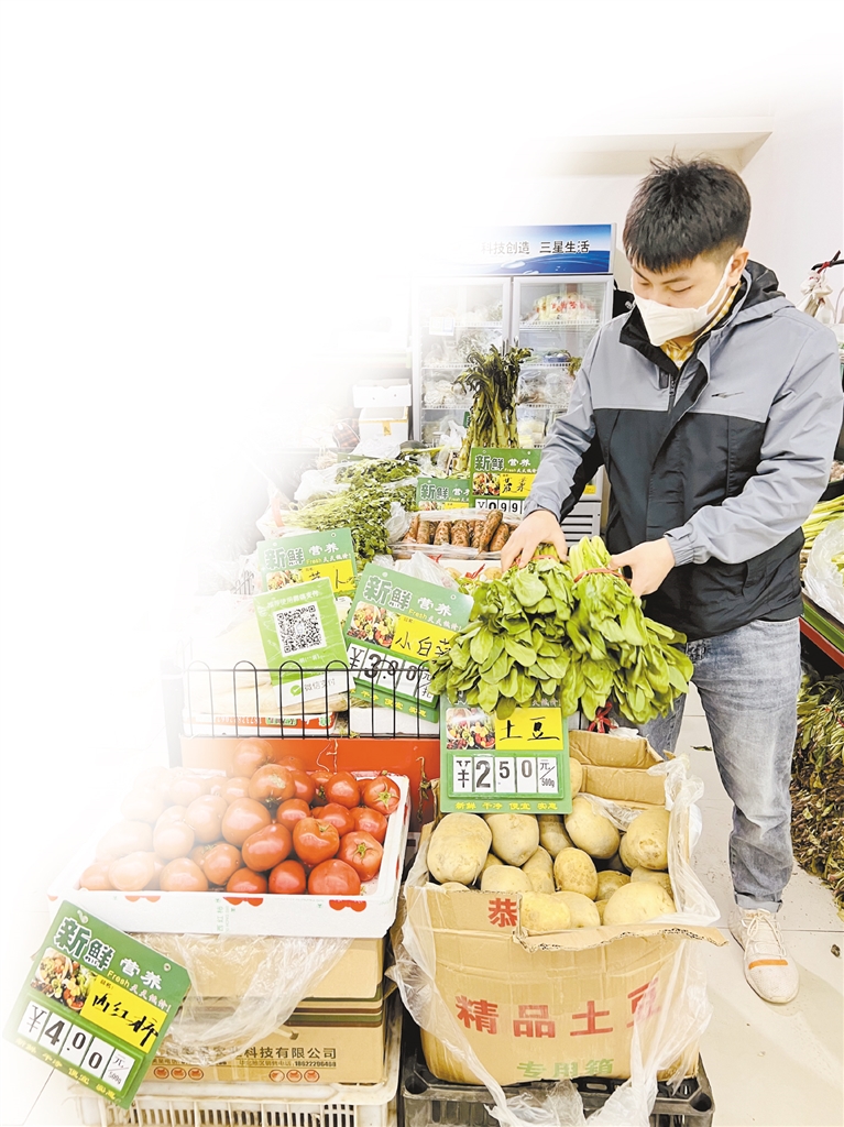 時(shí)代商廈的蔬菜區(qū)食品部副經(jīng)理黃亞雄正在超市內(nèi)巡查著,一邊看著貨架上的貨品,一邊和理貨員溝通著。“我們這邊的供貨量比較穩(wěn)定。今天大家節(jié)后第一天上班,采買的人還不太多。我們的蔬菜區(qū)分兩塊,一塊是大陸菜(本地菜),一塊是無公害菜(外地菜),價(jià)格相差不多。這幾天價(jià)格也多少回落了。”黃亞雄說,供貨渠道一直都在協(xié)調(diào),“有的地方因疫情原因物流受影響,但我們這邊供貨量沒受到影響,能夠保證市民日常所需。”理貨員魯紅茹邊整理著蔬菜邊說:“我們每隔幾天就會推出一些菜搞促銷,像今天黃瓜3.9元,綠甘藍(lán)2.9元,菜花4元,大白菜2.4元一直價(jià)格沒變,買的人不少。”