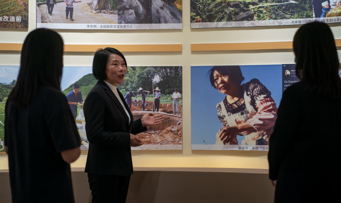 謝成芬在西疇縣“西疇精神”展覽館里講述治理石漠的故事(3月26日攝)。新華社記者江文耀攝